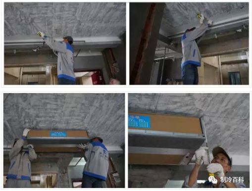 ①吊裝中央空調(diào)室內(nèi)機(jī),并對(duì)內(nèi)機(jī)進(jìn)行包裹,避免有灰塵雜質(zhì)進(jìn)入;